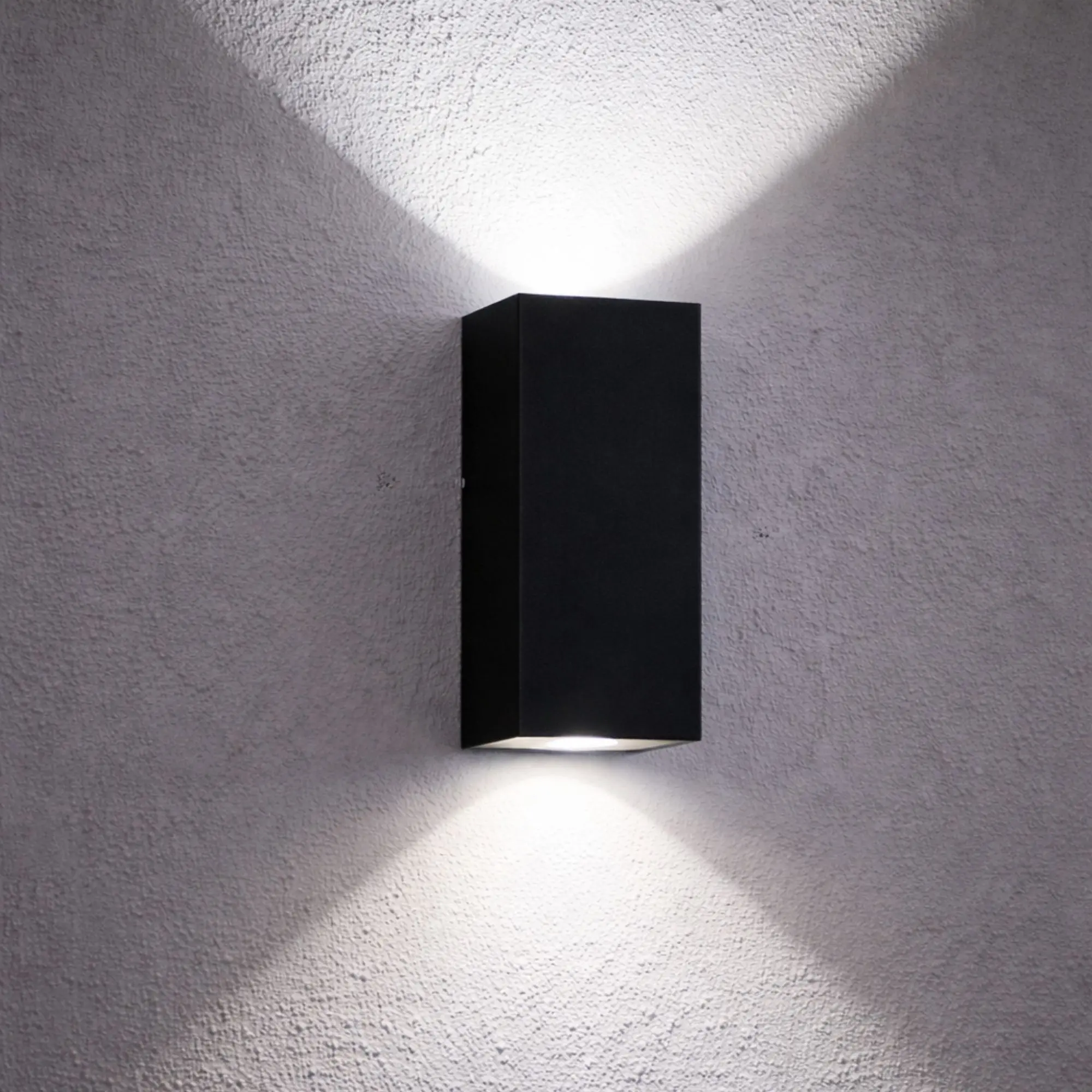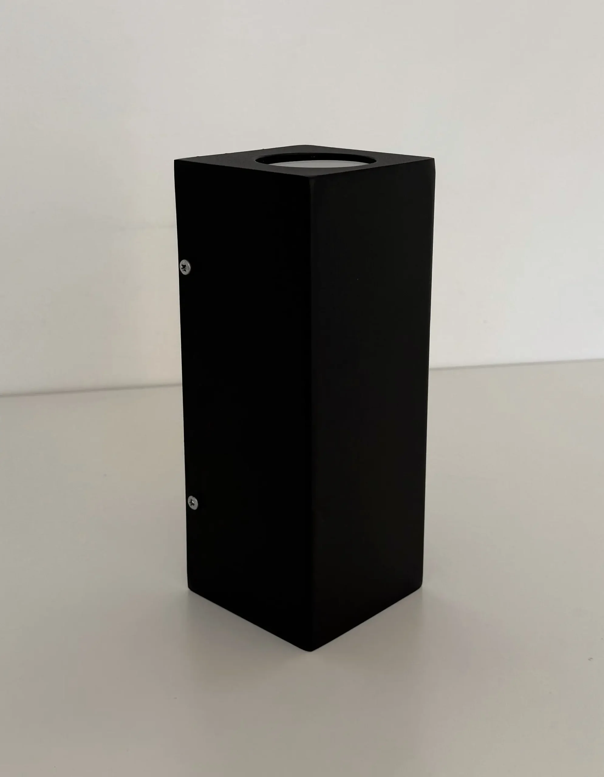 Alto: 200 mm; Ancho: 80 mm; Profundidad: 80 mm; Zócalo: GZ10 x 2; Apto lámpara: DICROICA LED; Color: Negro / Blanco / Gris; Material: chapa al carbono 1 mm y vidrio transparente 4 mm; Acabado: microtexturado; Colocación: Pared Exterior – Interior.