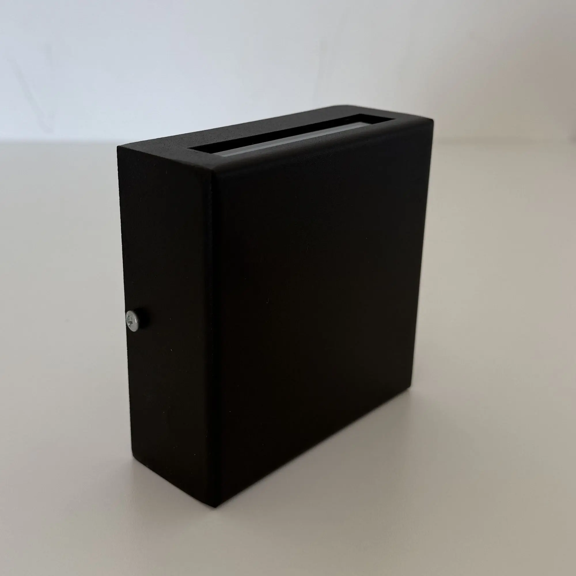 Alto: 105 mm; Ancho: 105 mm; Profundidad: 45 mm; Zócalo: G9; Material: chapa al carbono y vidrio 3mm; Colocación: Pared Exterior/Interior.