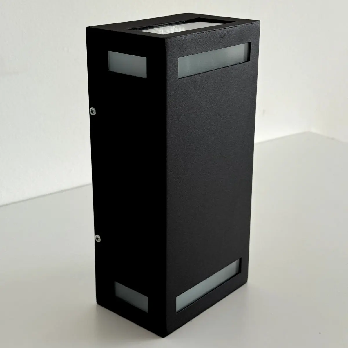 Alto: 240 mm; Ancho: 120 mm; Profundidad: 80 mm; Zócalo: GZ10 x 2; Apto lámpara: DICROICA LED; Color: Negro / Blanco / Gris; Material: chapa al carbono 1 mm y vidrio transparente/esmerilado 4 mm; Acabado: microtexturado; Colocación: Pared Exterior – Interior.