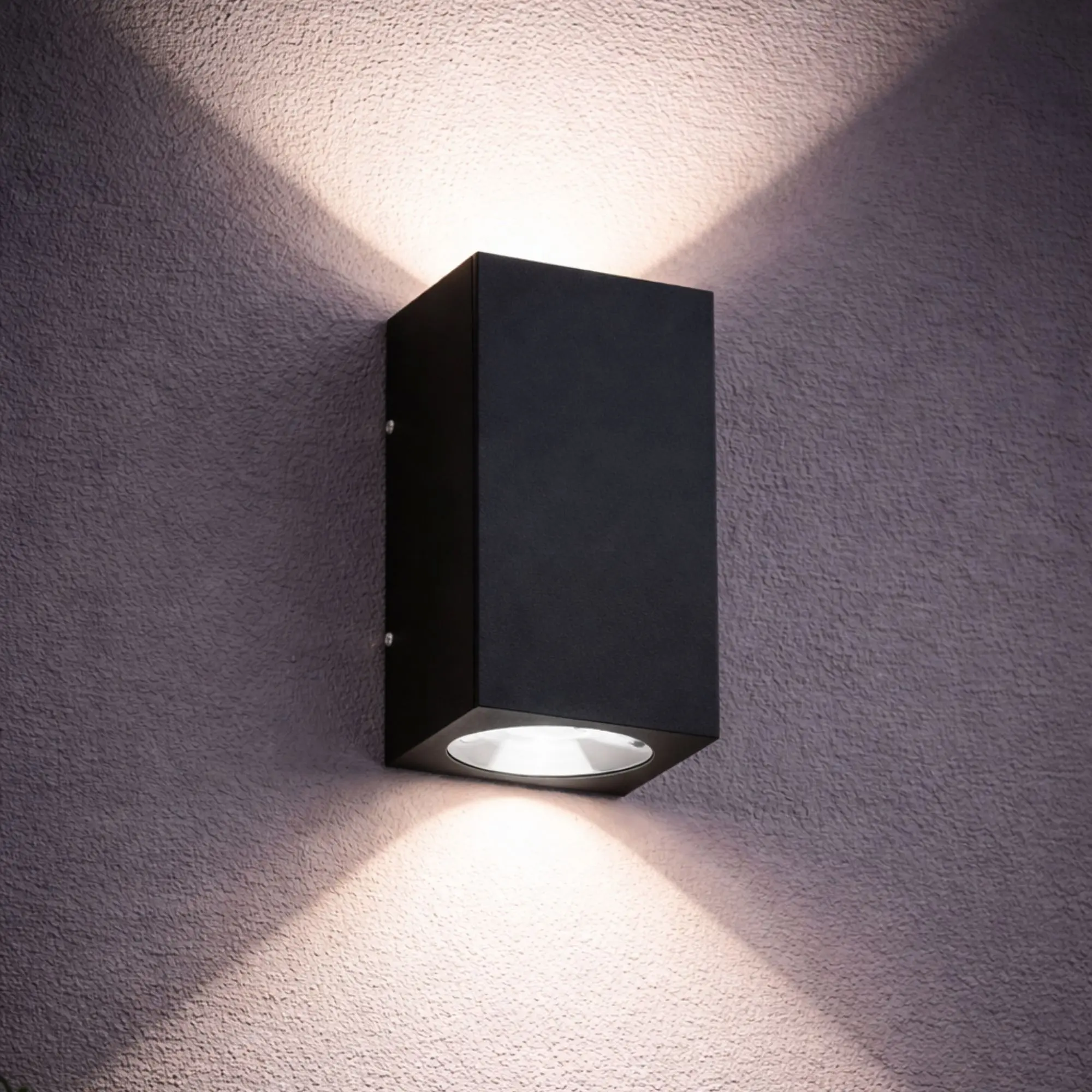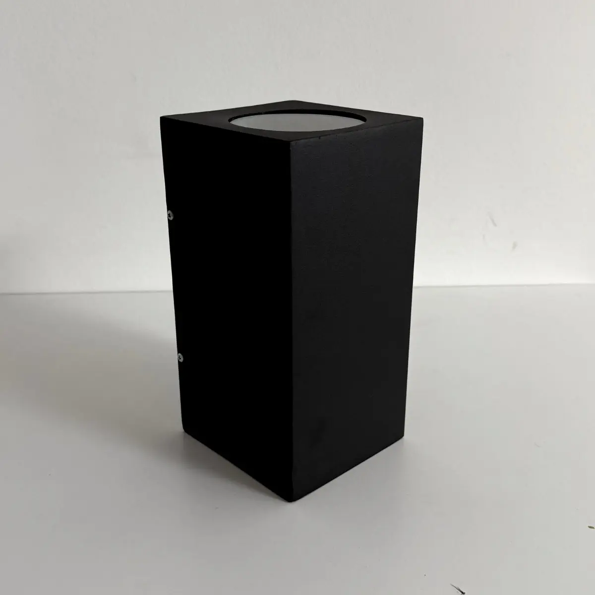 Alto: 240 mm; Ancho: 120 mm; Profundidad: 130 mm; Zócalo: GZ10 x 2; Apto lámpara: AR111 LED; Color: Negro / Blanco / Gris; Material: chapa al carbono 1 mm y vidrio transparente 4 mm; Acabado: microtexturado; Colocación: Pared Exterior – Interior.