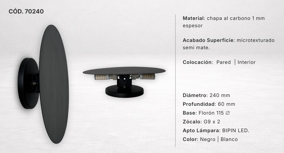 Diámetro: 240 mm; Profundidad: 60 mm; Zócalo: G9x2; Material: chapa al carbono 1mm; Colocación: Pared Interior.