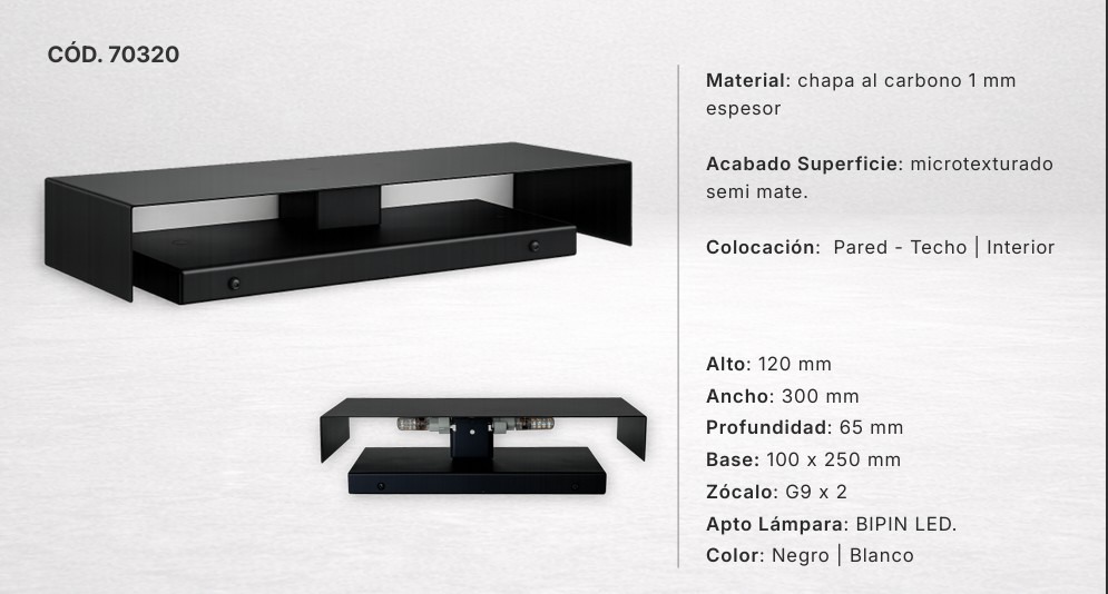 Alto: 120 mm; Ancho: 300 mm; Profundidad: 65 mm; Zócalo: G9x2; Material: chapa al carbono 1mm; Colocación: Pared/Techo Interior.