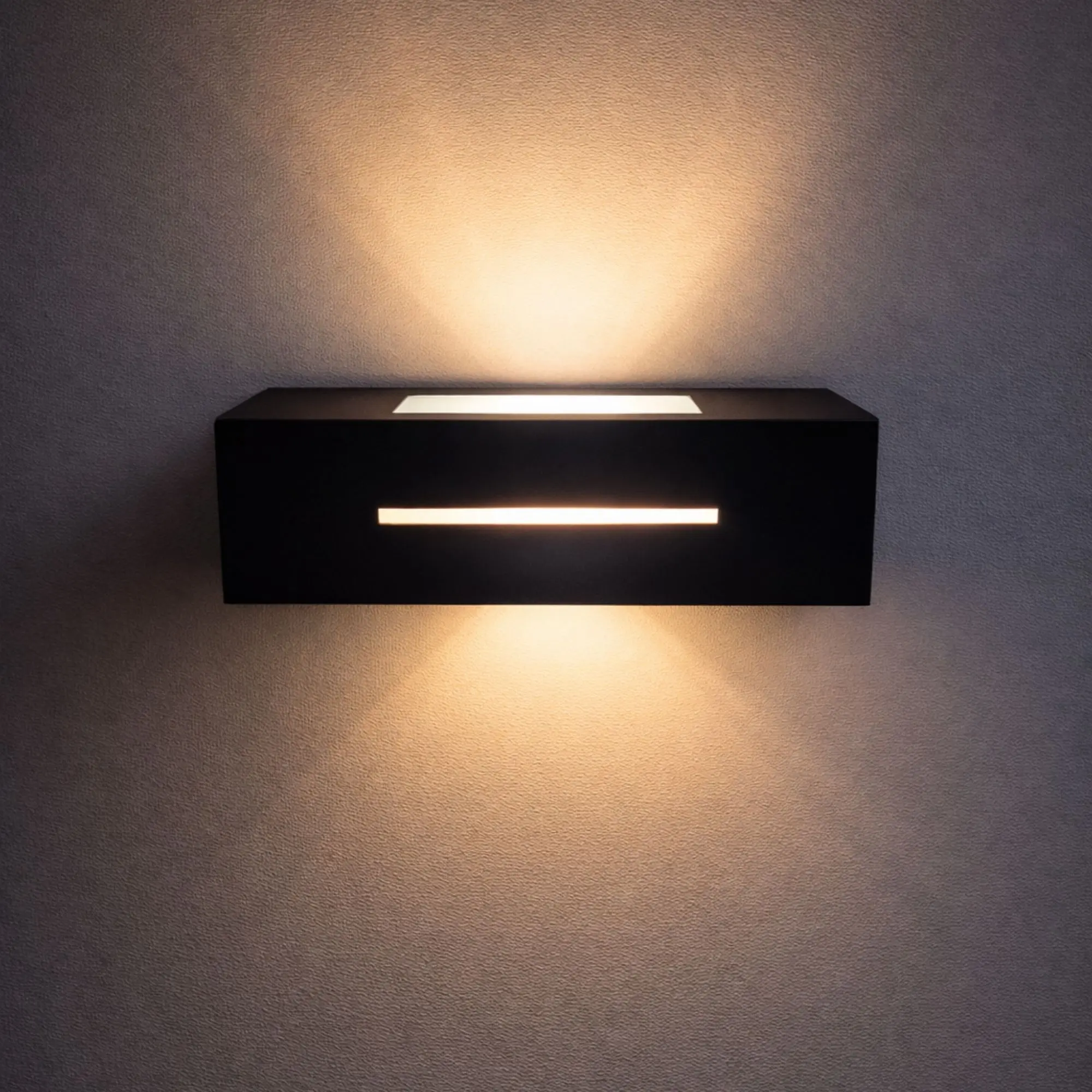 Alto: 78 mm; Ancho: 260 mm; Profundidad: 95 mm; Zócalo: E27; Apto lámpara: E27 LED; Color: Negro / Blanco / Gris; Material: chapa al carbono, vidrio esmerilado 4 mm y acrílico; Acabado: microtexturado; Colocación: Pared Exterior – Interior.